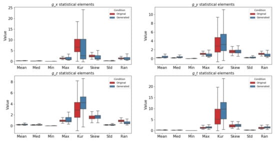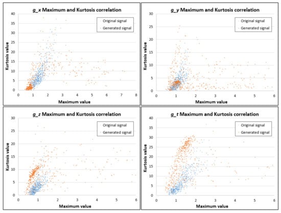 To verify the similarity between original data and generated data, we conducted the Kolmogorov-Smirnov test using Python version 3.7.4 []. The statistic value is 0.059, while the p-value is 0.336, so we can accept the hypothesis that signals are drawn from the same distribution. Figure 12 illustrates the relationship among all statistical elements between an original broken machine signal and a generated signal. The generated signal has a larger data variation distribution with taller boxed, which shows the variations during the generation phase. In Figure 13, by continuing to break down the relationship between the maximum and kurtosis values of the original and generated broken FFT of the signals, we can see high variations in the generated values. The linear regression test [] is conducted to verify the correlation between the maximum and kurtosis values. The coefficient of determination is calculated and shown in Table 7. With the high value of Coefficient of Determination in all dimension g_x, g_y, g_z, and g_t, we can conclude that the maximum and kurtosis has a high correlation in fault signal. Compared with the original signal, the generated signal has a lower Coefficient of Determination, indicating that it has higher variation and less dependent on each other. This variation is good for the training phase because it can improve the machine learning models with different input patterns.