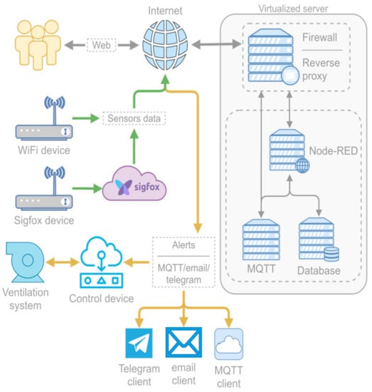 There are some situations where there is not an airflow system installed. The air quality control system can send alerts to the configured user via different channels: it can send emails, MQTT messages to the MQTT topic configured for the device, and send messages to a Telegram bot associated with the device. The system can inform the users configured for a given monitoring device via any of those channels. Once notified, the users can decide to open a window or any other measure to improve the air quality.