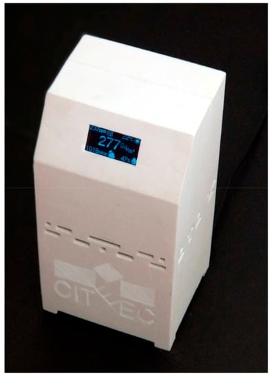 The monitoring devices have an OLED display for visualizing all the readings in real-time. The sensors, processing unit, and the OLED display are assembled in a 3D printed case of 15 × 15 × 30 cm. Figure 3 shows the aspect of the monitoring device.
