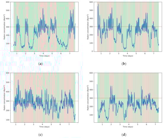 The background of each image in Figure 5 shows, in red, when the prediction algorithm activated the ventilation system. Table 2 shows the mean radon concentration for each interpolation time window tested, the maximum level reached, and the total time the airflow system was turned on during the week that each test lasted.