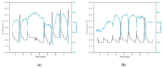 The air quality metric used for all the tests is based on the radon concentration. This metric is critical due to high radon concentrations being a direct health risk that has a more immediate impact than other environmental measures such as temperature or humidity. Despite this, it is interesting to evaluate the evolution of temperature and humidity during the tests due to the effect these variables have on energy efficiency, thermal comfort, noise pollution, and indoor environmental quality. Figure 7 shows the temperature and humidity evolution for each interpolation time window tested for a week.