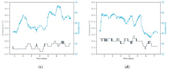 Evolution of temperature and humidity during a week for the tested interpolation time windows: (a) 10 min; (b) 30 min; (c) 1 h; (d) 2 h.