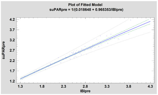 It was noted that the CRP level was not related with the suPAR level before treatment (correlation coefficient, CC = 0.21; p = 0.0587), while the increase in CRP level after treatment indicated a relatively weak relationship with suPAR level (CC = 0.34; p < 0.05). Nevertheless, when examining the relationship between CRP and suPAR level independently of the patient’s age, i.e., IBI, a relatively weak relationship between variables was found before surgery (CC = 0.24; p < 0.05) as well as after surgery (CC = 0.32; p < 0.05). Obviously, the suPAR level was strongly related to the IBI value: pre-operationally (CC = 0.98; p < 0.001) and post-operationally (CC = 0.98; p < 0.001). This relationship weakens slightly in the higher suPAR values because there is a dispersion of age-related results in the suPAR, which the IBI parameter does not reveal (Figure 2).