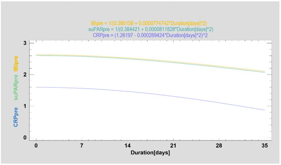 Preoperative values of the examined markers (CRP—blue line, suPAR—green line and IBI—yellow line) according to the duration of minor complications expressed in days. CRP values are given in mg/L, suPAR values in ng/mL and IBI is an index without unit. Preoperative suPAr and IBI values are weakly related to the duration of postoperative complications.