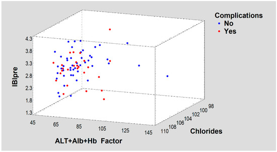 A three-dimensional space defined by ALT + Alb + Hb Factor, IBIpre and Chlorides Chlorides showing a scattering of dichotomous treatment results (Complications).