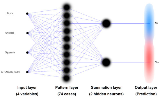 Clinical complication incidents were established as the classification factor (Complications) in a probabilistic neural network (PNN). Input variables were: IBIpre, Chlorides, Glycaemia and ALT + Alb + Hb Factor (meta-variable obtained from the FA). Two neurons were built in summation hidden layer. Among the 74 complete cases in the training set, 74% were correctly classified by the PNN. Results of complication prediction are presented on Figure 5.