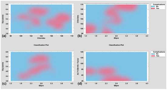 Detailed results of PNN predictions indicate that complications should be expected (Figure 6d) in patients with lower preoperative IBI results (i.e., 1.8–2.7) in whom ALT + Alb + Hb_Factor is low (i.e., 65–90) simultaneously. Moreover, these two variables indicate the possibility of complications after surgery when the IBI takes average values (i.e., 2.2–3.4) and ALT + Alb + Hb_Factor is extremely low (i.e., 45–60) and when the IBI is extremely low (i.e., 1.3–1.7) and ALT + Alb + Hb_Factor takes moderately low values (i.e., 66–86). It can also be observed that the frequency of complications increases when the intermediate IBI pre (i.e., 2.3–3.1) in combination with intermediate Glycaemia level (i.e., 4.8–6.5 mmol/L) is present in the patient simultaneously (Figure 6c). The relationship between Chlorides and the occurrence of these minor complications is more complex. In a two-dimensional evaluation with IBI it can be seen a spread of complications from patients with extremely low both Chlorides values (i.e., below 102 mmol/L) and IBI (i.e., below 1.8), up to patients with high Chlorides values (i.e., 106–110 mmol/L) and intermediate IBI values (i.e., 2.3–3.5) (Figure 6b). When looking at the relationship between Glycaemia with Chlorides and the occurrence of complications, two local maximum probabilities of complications can be identified (Figure 6a): 1. medium-low Chlorides (i.e., 101–105 mmol/L) together with higher Glycaemia (i.e., 5.9–6.6 mmol/L); 2. more concentrated place with medium-high Chlorides (i.e., 101–105 mmol/L) together with intermediate Glycaemia (i.e., 4.5–5.9 mmol/L). In general, it can be observed that higher IBI values (i.e., 2.3–3.5) are generally related with postoperative complications (Figure 6b–d).