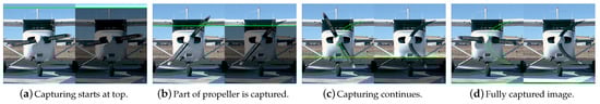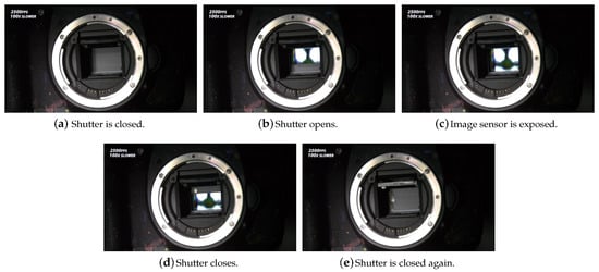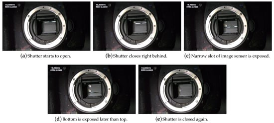 Most cameras, e.g., smartphones and webcams as well as most DSLR (Digital Single-lens Reflex) cameras, are using a rolling shutter. This means the picture is not captured as a whole, but line by line from top to bottom. When taking a photo with a DSLR camera, the shutter opens from top to bottom, then the image sensor is exposed to light, then the shutter closes again from top to bottom. This procedure for a rather slow shutter speed or long exposure time, respectively, of 1/30 of a second is depicted in the images in Figure 1 recorded with a high-speed camera. Figure 2 shows the same recorded operation with the exposure time set to 1/8000 of a second. One can see that immediately after the shutter starts to open, it already starts closing. Only a narrow gap is opened to pass through light to the image sensor and this gap moves from the top of the image to the bottom. This also means that the top of the image is captured earlier than the bottom part of the image.