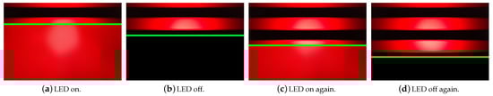 According to Plattner et al. [] there is also another, more significant error cause in this application area. Due to phase slipping and bigger ROIs, ambiguous LED states, as depicted in Figure 9, lead to errors. Such an ambiguous state appears if the modulated light source is captured in the exact moment when the LED transitions from ON to OFF or vice versa. In this case, the vertical position of the LED matches the position of a transition of the stripe pattern. In such a case, it is very hard to detect the current state of the taillight and to compare it with the previous. If the state is not recognized correctly, an error occurs. Additionally, such ambiguous taillight states usually not only affect a single frame. Often such a transition of the stripe pattern is slowly moving through the area covered by the modulated taillight and hence multiple consecutive frames are affected, which leads to an error burst. Such errors cannot be completely avoided with this modulation method, as there is always a chance of getting ambiguous light source states. Plattner et al. [] suggest minimizing the probability of such a situation to occur by setting the modulation frequency as low as possible to have wide stripes and only a few such transitions that cause ambiguous states of the taillights. However, this paper proposes a much more efficient way of dealing with this issue as the error is not just caused by the transition itself, and hence by the number of transitions. The main issue is that those transitions are affected by blooming and exposure effects.