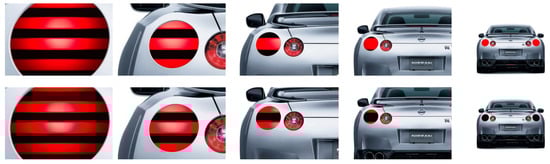 As Plattner et al. [] showed, the stripe pattern in the resulting image is only visible in those parts of the image that are occupied by the modulated light source. Hence, if the modulated light source only takes up a small part of the image, only a small part of the stripe pattern can be captured by the camera. As shown in Figure 5, if the taillights of a car are modulated and the camera is far away from the car, only one stripe or state, respectively, is visible in the image. However, the captured state of the taillight, depends on the position of the taillight within the frame, which is also visible in Figure 5. In the top image sequence, the car’s vertical position is slightly lower and hence, in the rightmost image, captured from big distance, a bright part of the stripe pattern is shown in the area of the taillights. In the bottom image sequence, the vertical position is slightly higher and hence, a different part of the stripe pattern is visible, which is dark. Thus, from one single image, just the current states of the taillights in the image can be detected; however, the receiver is not able to get any information regarding encoded data from it.
