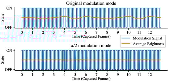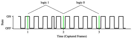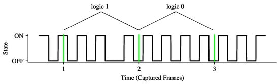 If the phase of the modulation signal is changed by 180°, i.e., the signal and the resulting stripe pattern are inverted, between two consecutive frames of a captured video, the receiving camera can detect if the state has changed since the last recorded frame. This state change always appears, independent of the position of the transmitting light source in the frames, given that the modulated light source did not move a significant amount between the two frames. The UDPSOOK modulation method by Liu et al. [] uses this characteristic to encode information with those phase shifts between two consecutive frames. If there was no phase shift, which means the state of the modulated light source is the same in both frames, a logic 0 was transmitted, if the state changed because of a phase shift between the frames, a logic 1 was transmitted.