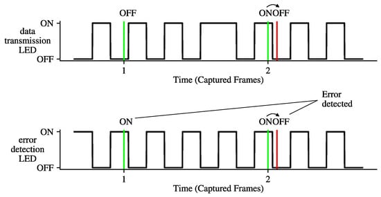 As the modulation of the light source and the sampling rate of the camera are not strictly synchronized, this modulation method is prone to errors caused by small synchronization offsets that result in phase slipping. Phase slipping can be perceived as slow and steady movement of the stripe pattern in the image between frames, even if no phase shifts were applied. This movement of the stripe pattern results in undesired state changes of the modulated LEDs in the captured frames, and hence errors are introduced. Liu et al. [] target this problem by proposing the usage of a second modulated light source for error detection. One LED sends the data, the second LED is only modulated with the modulation frequency without any phase shifts. In theory, this method can detect errors caused by phase slipping hland correct them, as depicted in Figure 8. They call this expansion UDPSOOK with error detection (UDPSOOKED). This error correction method works best, if the receiver knows exactly which pixel of the image it needs to observe, to detect the current state of the modulated LED and the position of this pixel does not change. However, in this paper’s application, first the modulated light source in the image, i.e., the taillight of a car, is detected and then the state of this taillight is recognized. This means a bigger region of interest (ROI) is observed to detect the state. The experiments for this paper’s application showed that this method is not able to improve the bit error rate (BER) significantly, as errors that could be detected this way rarely happen. For this case, it would be more efficient, to use the second modulated LED to double the raw throughput of the communication and use an adequate channel coding to add redundancy and correct such errors.