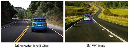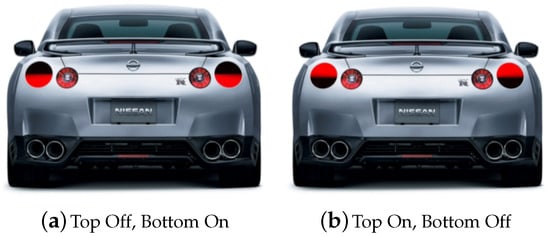 As the taillights used for modulation are usually in the same region of a car’s rear, the ROI for the taillights can be detected with a static calculation using the following formulae from Plattner et al. [], where the positions of the car C and the taillights and are defined by l, r, t and b representing the left, right, top, and bottom border of the bounding box, respectively.