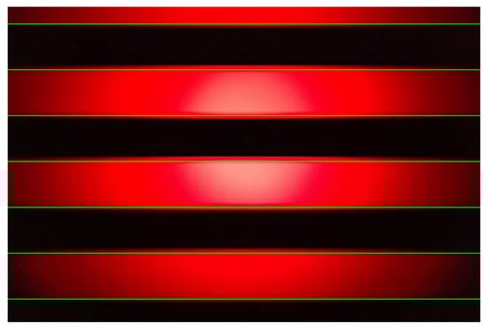 Blooming is a phenomenon in which excess charge from a pixel spills over into adjacent pixels, causing blurring and related image artifacts. Blooming may cause the neighboring pixels to look brighter than an accurate representation of the light absorbed by the photo diode in that pixel []. In case of UDPSOOK modulation, blooming causes bright stripes of the resulting stripe pattern to be wider than dark stripes, because the charge from a bright stripe spills over to the adjacent pixels of the dark stripe. Figure 10 shows this effect in an example image, where one can see that the blooming effect is strong in the center of the image where the bright center of the LED was captured and is weaker on the left and right side due to the slightly shifted angle of the emitted light. The green lines indicate the edges of the rectangular signal used for the modulation. Due to the blooming effect the bright stripes are wider than the dark stripes when the pulse width of the modulation signal is 50%. The parts of the image affected by blooming cannot represent the encoded data correctly, because in these parts of the image, the modulated LED always appears to be ON, even if the signal is inverted by a phase shift. This paper proposes to adjust the pulse width ratio of the modulation signal to counteract the blooming effect. If the pulse width ratio is intentionally below 50%, the blooming effect is neutralized and the BER should be improved.