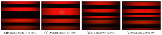- Modulation mode: With this settings flag, it can be selected how phase shifts are applied if a logic 1 needs to be transmitted to encode the message. With the standard mode, the signal is inverted by toggling the phase between 0° and 180°, or 0 and , respectively. In the mode the phase is shifted between 90° and 270°, or and , respectively. This mode allows inversion of the signal with smaller changes of the average brightness of the light source, and hence, the modulation cannot be perceived by a human observer. Figure 13 shows how the application of a phase shift to transmit a logic 1 looks in a close-up image of the modulated light source for both modulation modes.