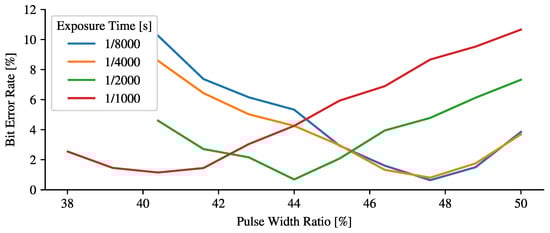 Blooming and exposure time affect the width ratio of the stripes in the resulting stripe pattern in a captured image. Even if the modulation signal has a pulse width ratio of exactly 50%, the bright stripes are slightly wider than the dark stripes. In those areas, the modulated signal cannot be decoded, because if the modulation signal is inverted to transmit a logic 1, the state of the light source will be ON in both captured images. This causes errors in the communication, and hence needs to be optimized. As this effect occurs when a transition of the stripe pattern passes through the area of the modulated taillight, for this evaluation the modulation frequency was slightly adjusted to be marginally slower than the desired 120 Hz, i.e., 119.96 Hz. This way, the communication still works fine; however, the stripe pattern is slowly moving down in the image and hence, more such transitions occur. This way, more relevant data is available to evaluate the approach. To improve the error rate in those transition cases, the pulse width ratio in the system was slightly decreased to counteract the effects of blooming and exposure and get equal stripe widths in the captured frames. In the experiments, the pulse width ratio of the modulation signal was optimized to get the best possible BER. This experiment was carried out for exposure times of 1/8000 s, 1/4000 s, 1/2000 s, and 1/1000 s. The resulting BER for all tested combinations of exposure time and pulse with ratio are depicted in Figure 15. The experiments showed that for an exposure time of 1/1000 s, the best BER of 1.15% can be achieved using a pulse width ratio of 40.4%, i.e., the length of the ON cycle is decreased by 800 µs with unchanged modulation frequency. For 1/2000 s exposure time, the best BER was 0.69%, so better than when using 1/1000 s exposure time. This was achieved by setting the pulse width ratio to 44%, i.e., shortening the ON cycle by 500 µs. For exposure times of 1/4000 s and 1/8000 s similar results were measured. The best BER of 0.81% and 0.64%, respectively, was achieved by setting the pulse width ratio to 47.6%, i.e., the duration of the ON cycle of the modulation signal decreased by 200 µs. As expected, the optimal pulse width ratio decreases for longer exposure times, as a longer exposure time increases the width of the bright stripes in the captured image. However, the optimal pulse width ratio for an exposure time of 1/4000 s and 1/8000 s is equal. It can be concluded that with such a short exposure time, blooming has a more relevant effect on the resulting width of bright stripes in the image, as the blooming effect is independent from the exposure time. The results also show that a balanced pulse width ratio of 50% is not optimal, but the results of previous research [] was confirmed with a BER between 3.5% and 4%.