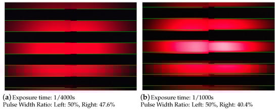 Figure 16 shows close-up images of a modulated light source to compare them, regarding the resulting stripe pattern. Figure 16a compares two images captured using an exposure time of 1/4000 of a second. On the left, the resulting stripe pattern with a pulse with ratio of 50% is depicted, on the right the improved version with an adapted pulse width ratio of 47.6% is shown. The green lines indicate a perfectly balanced distribution between bright and dark stripes, i.e., the edges of the modulation signal with a pulse width ratio of 50%. In the center of the image those green lines are interrupted for better visibility of the differences between the left and the right part of the image. However, with a modulation signal with a pulse width ratio of 50%, the resulting bright stripes are wider than the dark stripes, due to the blooming effect and exposure. With a pulse width ratio of 47.6%, those effects are neutralized to get an optimal distribution of stripe widths for the best possible BER. The effect of this approach can be seen even better, if an exposure time of 1/1000 of a second is used for capturing such close-up images as shown in Figure 16b. Here again a pulse width ratio of 50% was used to capture the left part of the image and the green lines indicate an equal distribution. It is clearly visible that the bright stripes in the left part of the image are wider than the dark stripes. For the right part of the image the pulse width ratio with the best results regarding the BER for data transmission was used, i.e., 40.4%. The effects of blooming and longer exposure time are counteracted using this lower pulse width ratio and the resulting bright and dark stripes have equal widths.