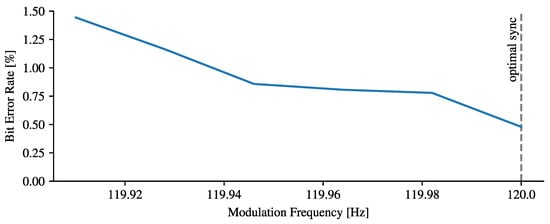 This VLC system is not strictly synchronized. Thus, if the transmitter and receiver systems are not perfectly in sync, errors might occur. The sampling frequency of the receiving system is hard to adjust, hence the modulation frequency was set to a perfect multiple to get a loose synchronization. The impact of synchronization offsets or phase slipping was evaluated by analyzing the BER of the communication system with slightly different modulation frequencies over a long period of 15 min of communication. With such a long time span, even the best adjusted loose synchronization runs into errors caused by phase slipping some time. The results depicted in Figure 17 show the resulting BER over the chosen modulation frequency. As the camera on the receiving side has a frame sampling rate of 30 Hz, the perfect modulation frequency for the transmitter is 120 Hz. A close-up setup was used to see the whole stripe pattern in the captured image and the modulation frequency was tuned, so that no movement of the stripe pattern could be perceived. This is what was considered the best possible loose synchronization. For the other measurements, the modulation frequency was slightly changed to purposely get a synchronization offset. The results show how such a synchronization offset in this not strictly synchronized system affects the BER.