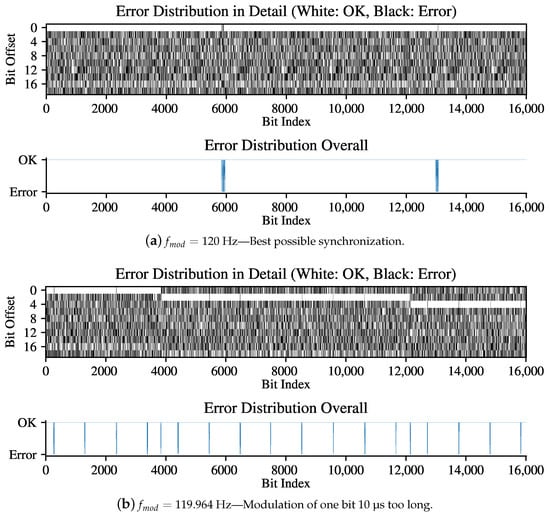 Figure 18a shows that even with the best possible synchronization the system runs into error bursts, because even here the stripe pattern is slowly moving. In this transmission one can see two error bursts. The first one lasts from bit index 5831 to bit index 5960, i.e., 2.15 s, the second one from bit index 12,972 to bit index 13,077, i.e., 1.75 s. The time between the two error bursts is approx. 2 min. However, within the time of this transmission the bit offset does not change because no bit is missing or duplicated.