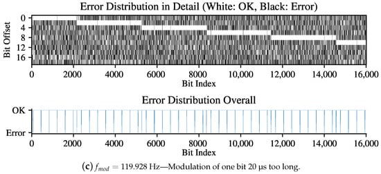 In the last transmission example shown in Figure 18c, the modulation of one bit takes 20 µs too long. Here the average time between two error bursts is only 5.5 s where each of them lasts about 250 ms. Within the transmission time of approx. 4.5 min, the bit offset is increased 5 times, which causes additional error bursts. However, as in the previous example, 8 equidistant error bursts occur before the bit offset is increased which causes an additional error burst.