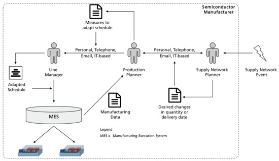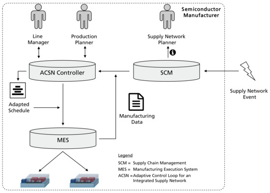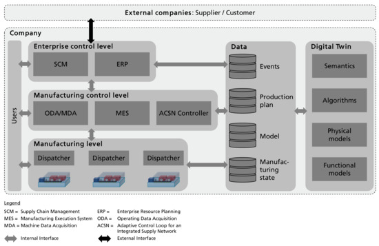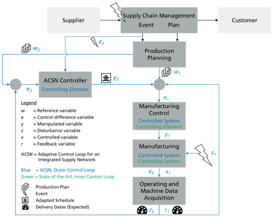 - Bauer, D.; Bauernhansl, T.; Sauer, A. Approach for an Adaptive Control Loop between Supply Network and Manufacturing. Procedia CIRP 2020, 93, 1552–1557. [Google Scholar] [CrossRef]