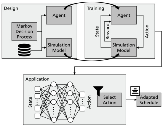 - Kuhnle, A.; Kaiser, J.P.; Theiß, F.; Stricker, N.; Lanza, G. Designing an adaptive production control system using reinforcement learning. J. Intell. Manuf. 2020. [Google Scholar] [CrossRef]