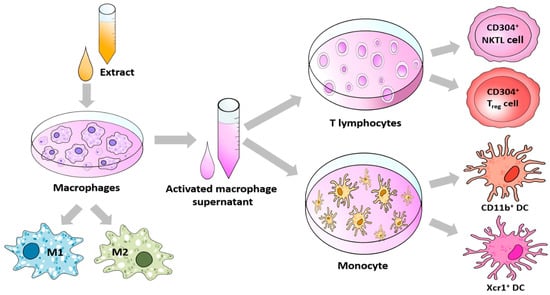 Schematic workflow for experimental procedures. The macrophages were exposed to the extract for the polarization. Under the extract, the supernatants derived from macrophages were collected and exposed to T cells and monocytes. M1 and 2; macrophage 1 and 2, DC; dendritic cells, NKTL cells; natural killer T-like cells.