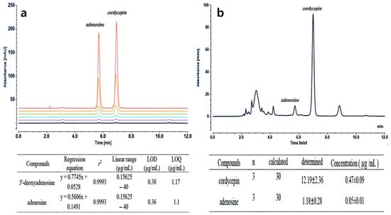 Determination of the cordycepin content in Cordyceps militaris extracts by high-performance liquid chromato-graphy (HPLC). Panel (a) showed the overlay chromatogram of various concentrations of the cordycepin and adenosine standards. Panel (b) showed the concentration of cordycepin in Cordyceps militaris extracts. (p < 0.05).