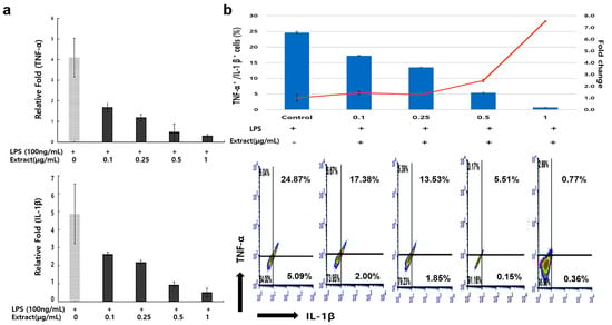Expression levels of IL-1β and TNF-α from macrophages activated by Cordyceps militaris extracts under lipopolysaccharides (LPS) stress. Expression levels of IL-1 β and TNF-α from macrophages using qPCR and FACSCalibur have been shown in the (a,b) panels, respectively. The bar graphs shown in the (b) panel are the relative fold changes of double-positive cells by the doses of the extract under LPS stress. (p < 0.05).