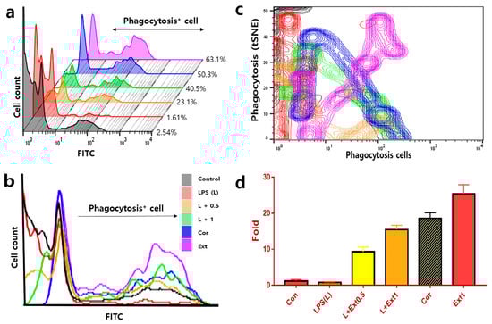 Activation of phagocytosis by Cordyceps militaris extracts in macrophages under LPS stress. Particles of E. coli were labeled with FITC. The phagocytosed macrophages were counted by flow cytometry and were analyzed by FlowJo software 10.6.1. The (a,b) (supplement graph for the panel (a)) panels show histograms of activation of phagocytosis by Cordyceps militaris extracts, and the (c) panel shows the visualizing datum using t-SNE for the phagocytosis. Panel (d) shows the relative fold changes for phagocytic activation by serial doses of the extract under LPS stress. LPS; lipopolysaccharide, Ext; extract, Cor; cordycepin (p < 0.05).