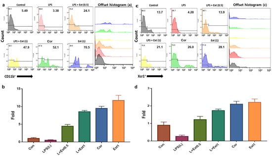 Dendritic differentiation by activated macrophages in the various conditioned media. Differentiated dendritic cells were counted by flow cytometry and were analyzed using the FlowJo software 10.6.1. Panels (a,b) show the density of CD11b+ cells under various conditions as follows: LPS only, extract 0.5 µg/mL and 1 µg/mL (Ext 0.5, 1), followed by LPS treatment, cordycepin, and extract. Panels (c,d) show the density of Xcr1+ cells under the same conditions. LPS; lipopolysaccharide, Ext; extract, Cor; cordycepin (p < 0.05).