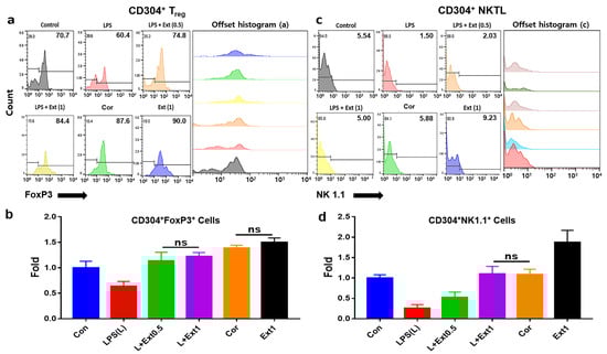 Lymphocyte differentiation by activated macrophages in the various conditioned media. After gating with CD304, the gated cells were distinguished from CD304+ Treg and natural killer T-like (NKTL) cells through expression of FoxP3 and NK1.1. Differentiated lymphocytes were counted by flowcytometry and were analyzed using the FlowJo software 10.6.1. Panels (a,b) show the density of CD304+FoxP3+ cells under various conditions as follows: LPS only, extract 0.5 µg/mL and 1 µg/mL (Ext 0.5, 1), followed by LPS treatment, cordycepin, and extract. Panels (c,d) show the density of CD304+NK1.1+ cells under the same conditions. LPS; lipopolysaccharide, Ext; extract, Cor; cordycepin, ns; not significant (p < 0.05).