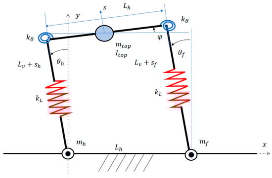 According to the previously mentioned assumptions, the proposed model consists of lumped masses connected by elastic elements, as shown in Figure 2. The first of these lumped masses () is located in the center of the spine; it represents the motor and spine masses, and a share (50%) of leg masses. The moment of inertia is the moment of inertia about the center of the spine. The other two masses ( and ) represent the masses of the front and hind feet and a share (50%) of leg masses. They are still. The length of the spine is denoted by , the lengths of the front and hind legs are , and the angles between the legs and the vertical direction are and , respectively. The spine and the legs are connected by torsional springs with stiffness . The legs of the robot are modeled as linear springs with stiffness .