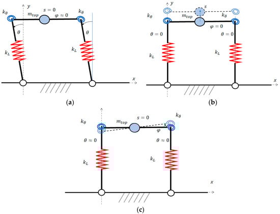 Variable represents the heave of the spine along the leg’s direction, which may be tilted by angle . Variables , , and are the generalized coordinates describing the motion of the deformable linkage. The equations of the vibrations of the robot can be derived with the Lagrange’s method [41]: