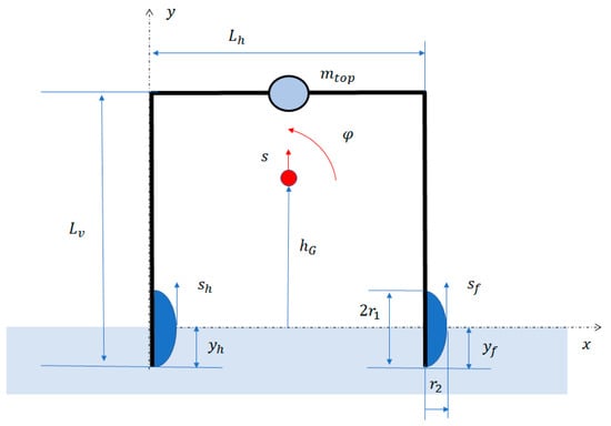 in which is the height of the center of mass with respect to the water level (see Figure 4). Expanding the trigonometric functions in Taylor’s series, the following equations hold: