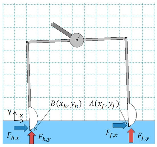 In Equations (38) and (39), is the density of water, and are the drag coefficients in the forward and backward directions along the -axis, respectively, and and are the vertical positions of the front and hind foot, so that and are the areas (subject to drag forces) of the submerged part of the front and hind foot, respectively. In Equation (40), and are the lift forces on the front and hind foot, respectively, is the lift coefficient of the foot subject to a vertical flow, and are the ratio of the submerged length of the front and hind foot with respect to the total foot length (2), respectively, and and are the front and hind foot speed along the -axis, respectively. As indicated in Equations (38) and (39), the drag forces are always opposite of the foot speed (usually , i.e., the foot is partially submerged). As indicated in Equations (38) and (39), the horizontal force is null if the foot is completely out of water.