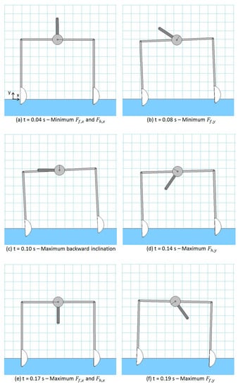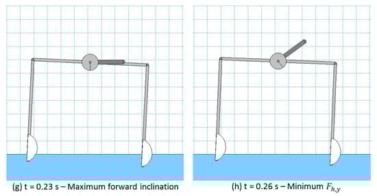 From the analysis of Figure 6 and Figure 7, the following considerations can be done. In the screenshot (a), the rotating link (carrying the eccentric mass) is vertical and pointing upwards and the feet of the robot are moving forward. In this configuration, the minimum (directed backwards and largest in modulus) horizontal drag forces are applied to the feet of the robot (see and at = 0.04 s in Figure 7). Moreover, in this configuration, the centrifugal force due to the rotating mass is pointing upwards, so the submerged part of the feet is less than in the static equilibrium configuration (rotating mass not moving).