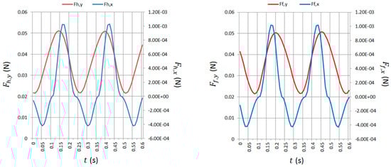 In the screenshot (e) (which is a dual configuration with respect to (a)), the rotating link is vertical and pointing downward and the feet of the robot are moving backward. In this configuration, the maximum (positive, i.e., directed forward) horizontal drag forces are applied to the feet of the robot (see and at = 0.17 s in Figure 7). In this configuration, the centrifugal force due to the rotating mass is pointing downward, so the submerged part of the feet is more than in the static equilibrium configuration. Therefore, the submerged area of the feet subject to horizontal drag forces is higher than in (a), and this contributes to have a higher value (in modulus) of the forward force with respect to the backward force related to (a). Nevertheless, the main reason why the absolute value of the maximum forward force (for each foot) is higher than the absolute value of the minimum (backward) force is because .