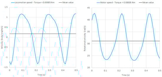 The dynamic behavior of the robot using a constant motor torque as an input has also been investigated. In particular, simulations have been carried out with torques (directed counterclockwise) from 0.00001 Nm to 0.01 Nm. For low torque values, i.e., from 0.00001 to 0.00004 Nm, the torque is not sufficient to rotate the eccentric mass. For torque values between 0.00004 and 0.0005 Nm, a stable periodic locomotion is obtained, after an initial transient. The locomotion speed, expressed in body length/mm (the body length is = 85 mm), the motor speed, and their mean values (0.173 body length/s and 31 rad/s, respectively) are reported in Figure 8 for an input torque of 0.00005 Nm.