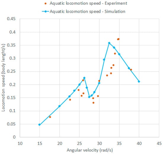 In Figure 9, the experimental and numerical aquatic locomotion speed as a function of (counterclockwise rotation) are overlapped. The numerical curve has been derived using the WM model presented in Section 4. It can be observed that there is good agreement between the resonance frequencies of the numerical and experimental model. A first resonance peak appears at about 26.5 rad/s and a second resonance peak appears at about 33–35 rad/s in both cases. These values are also in good agreement with the resonance frequencies computed with the linear model of Section 3.2 (28.8 rad/s and 34.2 rad/s). Moreover, the numerical and experimental curves are in good agreement and nearly overlapped. For higher values of (>40 rad/s), the numerical model cannot be used due to the increasing importance of the effect of waves generated by the robot (which are observed in the experiments). It is worth noting that the natural frequencies of aquatic locomotion are well below the natural frequencies of the structural modes studied in Section 3.1. Hence, the assumption of rigid robot in the model of aquatic locomotion is consistent with the actual operation of the robot.