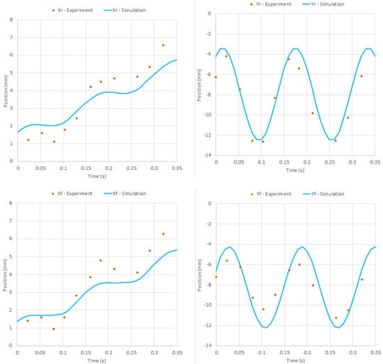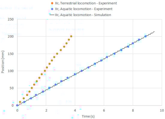 In Figure 10, the displacements of the hind foot are presented both for terrestrial and aquatic locomotion, which have been measured in experiments with = 38 rad/s. The experimental curves are almost linear, and this is related to constant locomotion speeds. In the case of aquatic locomotion, the experimental points are overlapped with the numerical curve, which is almost linear with small local peaks due to the periodic locomotion. The experimental and numerical results are in good agreement. A more detailed comparison between the experimental and numerical positions of the robot feet is depicted in Figure 11 considering a couple of periods of motion. Experimental and numerical data are in good agreement in this time scale as well: the period of the oscillations is the same and the error between the numerical curve and the experimental points is always less than 1.3 mm.