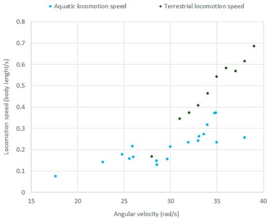 Terrestrial and aquatic locomotion speed vs. angular velocity of the eccentric mass.