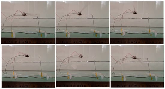 Figure 12 shows both the terrestrial and aquatic locomotion speed as a function of , as measured in the experiments. The figure shows that the robot reaches the highest speed on the ground when the eccentric mass rotates at an angular velocity of about 38 rad/s, and it reaches the highest speed on the water when the eccentric mass rotates at an angular velocity of about 35 rad/s, which is in accordance with the resonance peak found with the mathematical and numerical models of Section 3 and Section 4. In Figure 13, a sequence of photos showing an aquatic locomotion test with = 25 rad/s is presented.