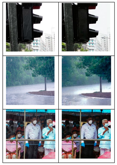 - Zhang, X.; Li, H.; Qi, Y.; Leow, W.K.; Ng, T.K. Rain Removal in Video by Combining Temporal and Chromatic Properties. In Proceedings of the 2006 IEEE International Conference on Multimedia and Expo, Toronto, Canada, 9–12 July 2006; pp. 461–464. [Google Scholar]
