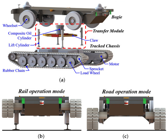 The overall compact design of the novel road-rail vehicle can be seen in Figure 1a. As shown in Figure 1a, this proposed vehicle consists of one tracked chassis, one bogie and a transfer module set. Figure 1b,c illustrate that the bogie and the tracked chassis are applied as the chassis for rail driving and road driving, respectively. The transfer module is responsible for the switching between two operation modes, which comprises one composite oil cylinder, one rotatable claw and four lift cylinders. The composite oil cylinder connected with claw is mounted on the bogie, which can hold up and rotate the whole vehicle. The lower ends of the lift cylinders are mounted on the tracked chassis, and the upper ends are connected to the bogie so that the lifting cylinders can change the distance between the bogie and the tracked chassis.