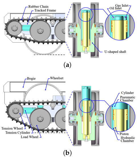 Figure 3 shows the structure of the cylinder-piston assembly and the suspension status in two operation modes. The suspension is mainly composed of an upper pneumatic chamber and a lower hydraulic chamber. The hydropneumatic cylinder-piston assemblies connect the load wheels to the tracked frame. The lower end (piston) is mounted on the U-shaped shaft with a load wheel. The upper end (cylinder) is fixed with the tracked frame. It should be emphasized that the design of the U-shaped shaft increases the total stroke of the suspension compared to the traditional unbent shaft. This design overcomes the height limitation of the tracked chassis and significantly reduces the risk of suspension breakdown.