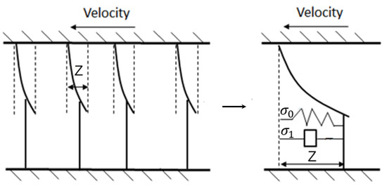 For the hydropneumatic suspension system, the friction force generated by the seal and guiding elements significantly impacts the vibration calculation. Many researchers have studied Coulomb friction characteristic in cylinders or actuators [24], but such as Karnopp and LuGre model [25,26] have been proved to be more effective on many occasions. Yanada and Sekikawa [26] studied the dynamic behaviors of friction using a hydraulic cylinder. They proposed a modification to the LuGre model to improve the simulation accuracy. The LuGre friction model takes the surface contact as the bristles’ elastic deformation under the micro-structure as shown in Figure 5. It can provide a comprehensive description of the static and dynamic characteristics of the friction between the piston and the cylinder. Whether the friction model parameters can be effectively and quickly identified from a large amount of experimental data is of great significance for improving the accuracy of the suspension model. This paper chooses the genetic algorithm (GA) to identify the friction model parameters because it has a comprehensive search range and is easy to obtain the optimal global solution.