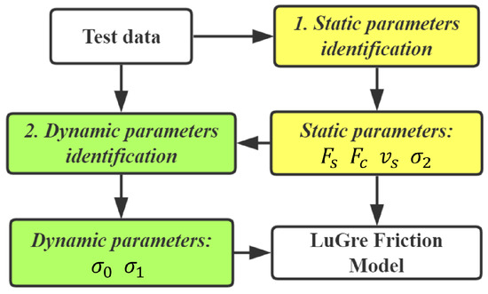 LuGre friction model includes four static parameters and two dynamic parameters. The GA program shown in Figure 6 indicates the whole process of parameter identification. The first step is to identify the static parameters , , and . In the static case, it is assumed that the bristles’ deformation has reached the maximum and that is to say the . In this step, the friction force can be expressed as: