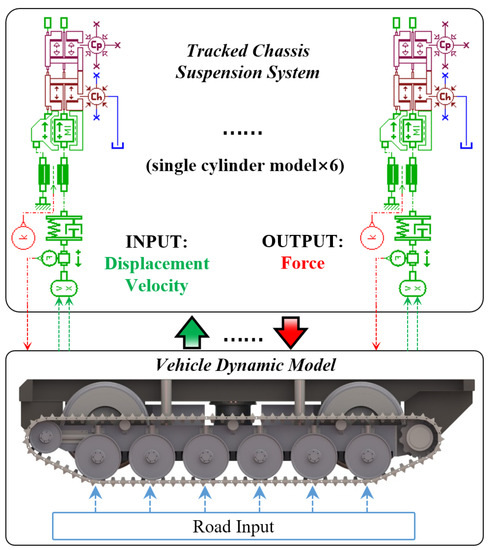 As stated in the introduction, many full or half tracked vehicle models have been developed for the systematic evaluation of suspension performance. Furthermore, a two-dimensional model of a tracked vehicle is found to be sufficient for detailed analyses of the suspension dynamics and associated shock and vibration environment of the vehicle [14]. Based on the verified single-cylinder model, the half-vehicle hydropneumatic suspension system is established by AMESim, as shown in Figure 10, which is composed of six hydropneumatic suspension units. Moreover, the MBD in-plane model of the vehicle is conducted based on the practical parameters in Table 4. The data exchange is carried out by the interface module between the two platforms. The aforementioned tension system in Figure 5 is taken as a spring force.