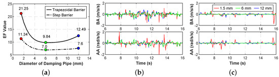 Performance comparison of different pipe diameters: (a) EF value (b) Acceleration values of trapezoidal barrier traversing (c) Acceleration values of step barrier traversing.